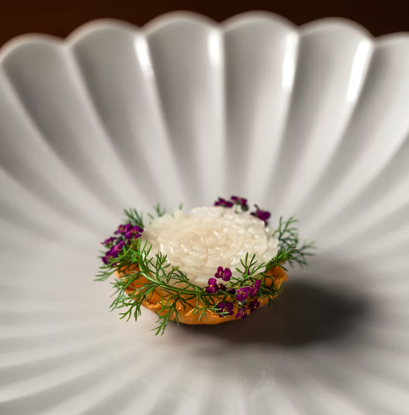 Panna Cotta – Mango, Curry Rojo, Abanico de Topinambur y Caviar Amur